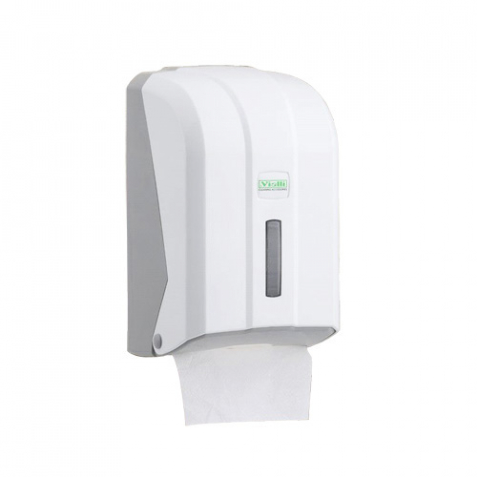 plastični držač toaletnog papira u listićima; kapacitet 200 listova; dimenzije listića za držač: 10.5x11cm (presavijenog), ili 10.5cmx21cm (maksimalno 11x22cm) dimenzije ispravljenog (otvorenog) listića; visina 22,4cm; širina 13,4cm; dubina 12cm