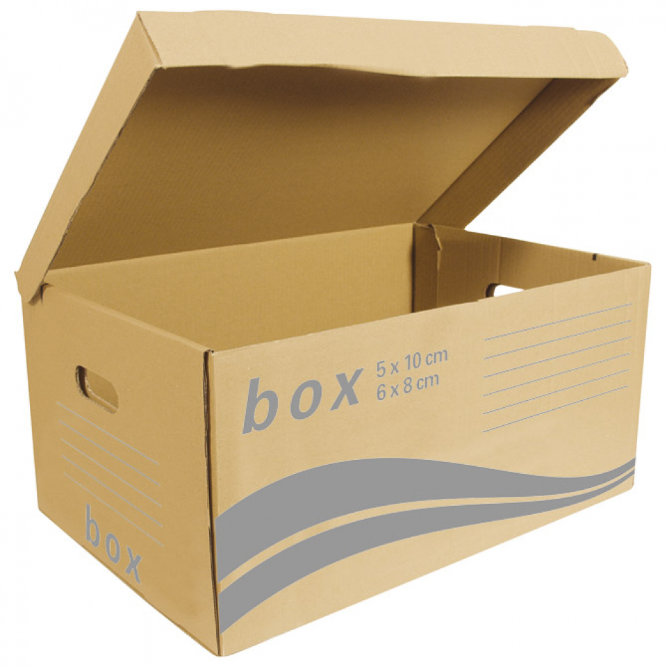 arhivska kutija; dimenzija: 540x360x253 mm; valovita ljepenka; kapacitet: 5 arhivskih kutija hrpta 100 mm ili 6 hrpta 80 mm; ručke za nošenje; smeđa boja