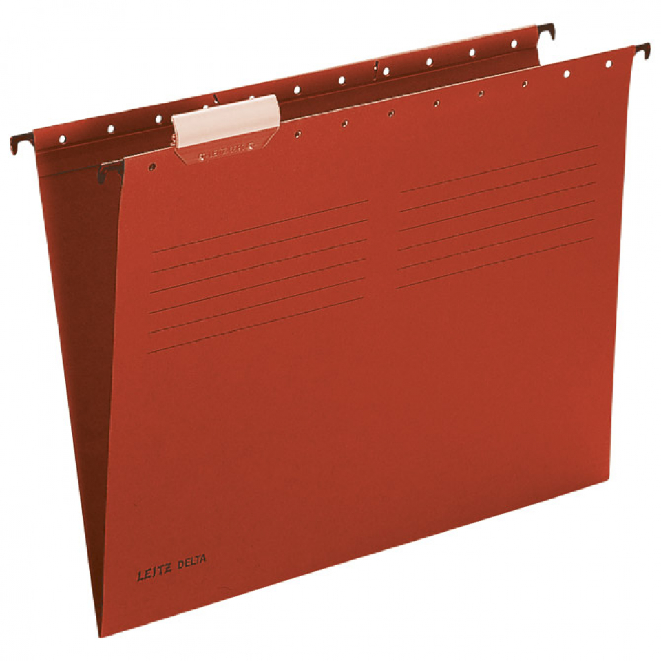 mapa viseća; format: A4; karton: 230 g/m², colorspan; razmak između kukica nosača: 330 mm; metalni nosači; "V" dno; pomični jahači; ojačane vodilice; bez mogućnosti međusobnog povezivanja; crvena boja