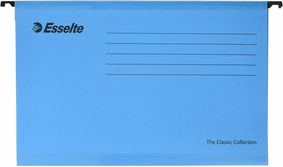mapa viseća; format: A4; karton: 210 g/m²; razmak između kukica nosača: 330 mm; metalni nosači; "V" dno; pomični jahači; bez mogućnosti međusobnog povezivanja; plava boja