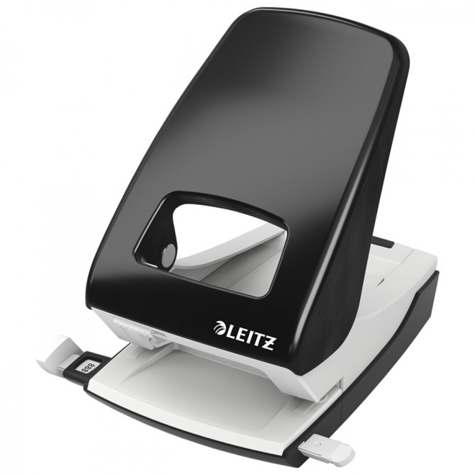 bušilica za papir s 2 rupe; buši do 40 listova ili 4mm; razmak između rupa je 80mm; s prozirnim spremnikom za otpadni papir; ima plastični graničnik za formate: A4, A5, A6; mogućnost fiksiranja gornjeg dijela; crna boja