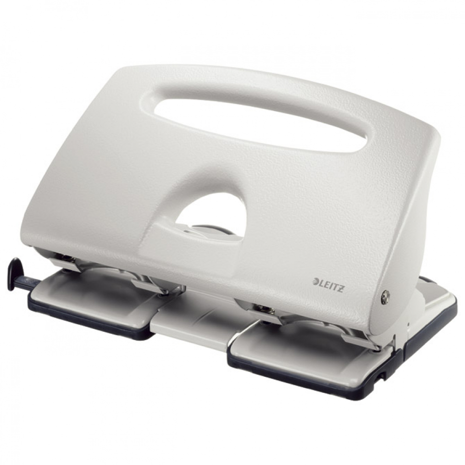 bušilica za papir s 4 rupe; buši do 40 listova ili 4mm; razmak između rupa je 80x80x80mm; s prozirnim spremnikom za otpadni papir; ima plastični graničnik za formate: A4, A5, A6; mogućnost fiksiranja gornjeg dijela; siva boja