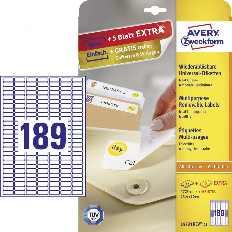 odljepljive univerzalne etikete; set od 25 listova; format A4; dimenzija 25,4x10 mm; sveukupno 4725; bijela boja
