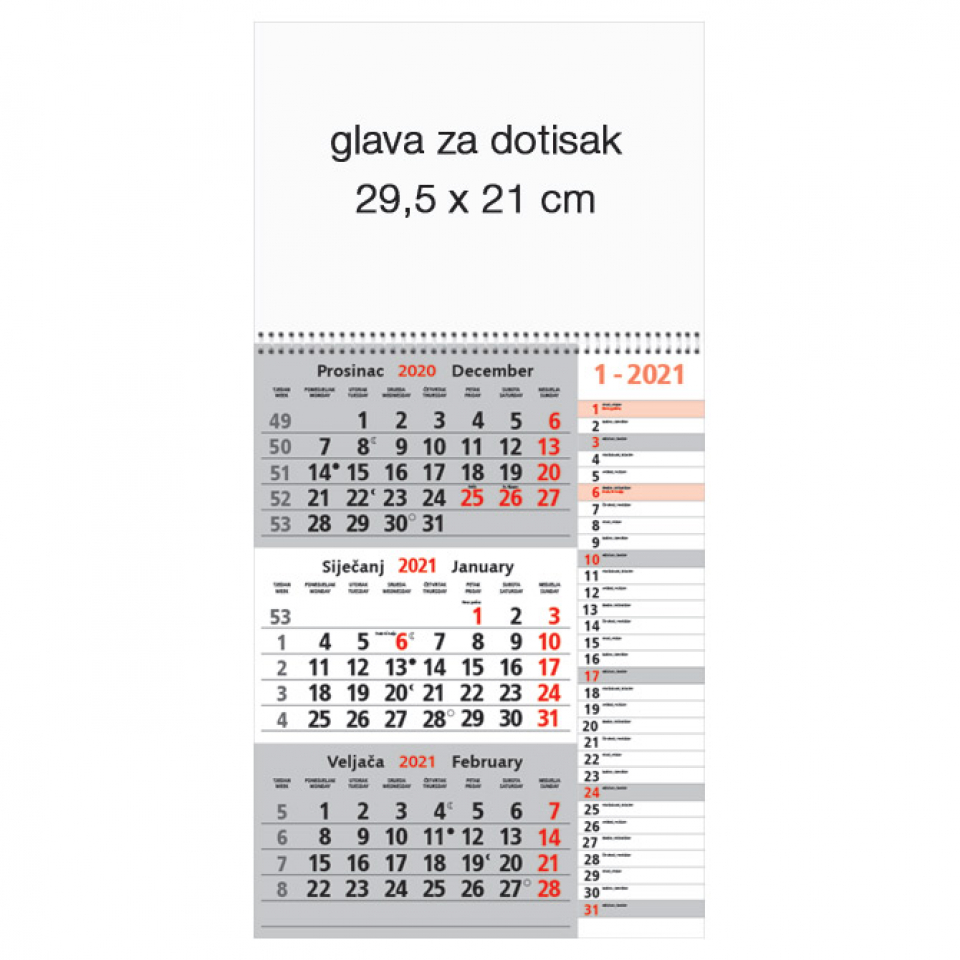 kalendar zidni za 2021. godinu; dimenzija: 29,5x39,3 cm; glava za dotisak: 29,5x21 cm; sa spiralom; pokazivač trn; na desnom rubu je memo; u natronskoj vrećici