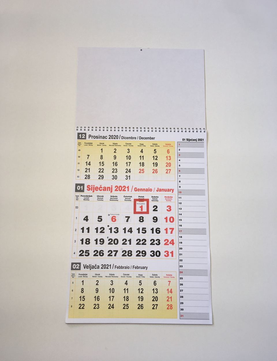 kalendar zidni za 2021. godinu; dimenzija: 41,2x29,7 cm; glava za dotisak: 20x29,7 cm; sa spiralom; pokazivač trn: žuta boja; marka Labinska Tiskara