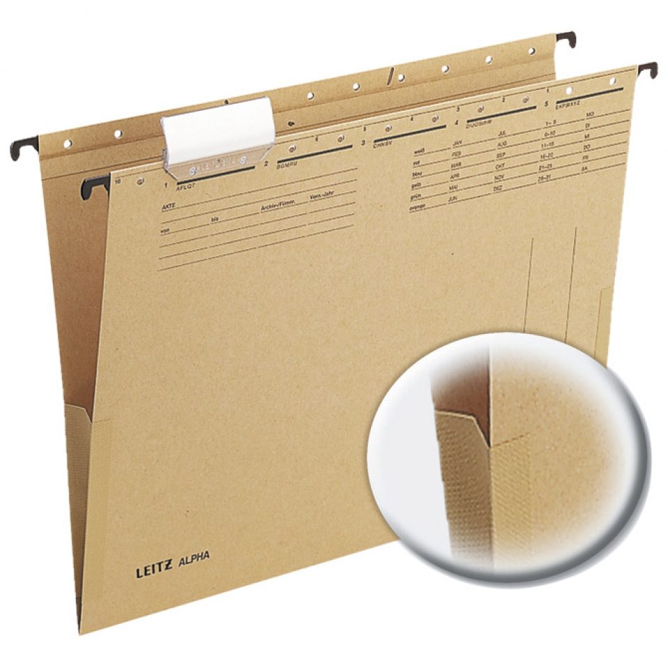 mapa viseća s platnom; format: A4; karton: 230 g/m², colorspan; razmak između kukica nosača: 330 mm; metalni nosači; "V" dno; pomični jahači; ojačane vodilice; bez mogućnosti međusobnog povezivanja; smeđa boja