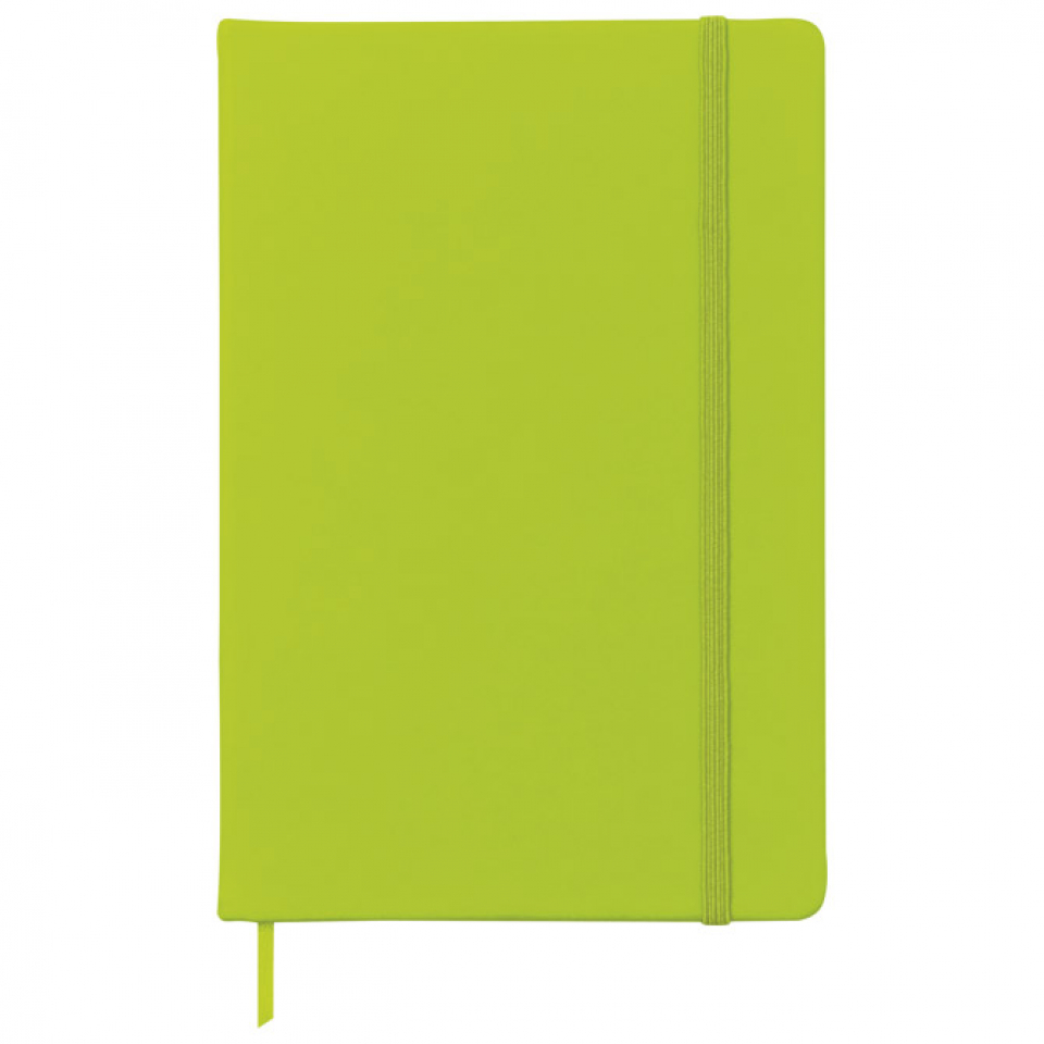 notes na crte; format A5; dimenzija 140x210mm; 96 listova; šamoa; tvrde korice sa zaobljenim rubovima; s gumicom u boji notesa; označivač stranica; svijetlo zelena boja